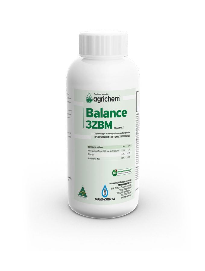 Το BALANCE 3 ZBM είναι υγρό εναιώρημα ψευδαργύρου, βορίου και μολυβδαινίου. Επιταχύνει την ανάπτυξη των καλλιεργειών, παρουσιάζει άμεση απορρόφηση, γρήγορη εξάπλωση και ομοιόμορφη κατανομή λόγω διαβρέκτη.