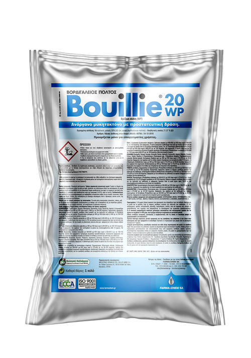 Το BOUILLIE είναι ανόργανο μυκητοκτόνο με προληπτική και προστατευτική δράση έναντι μυκήτων όπως κορυφοξήρα, κορύνεο, ανθράκωση, φουζικλάδιο, εξώασκο, περονόσπορο, κ.α.